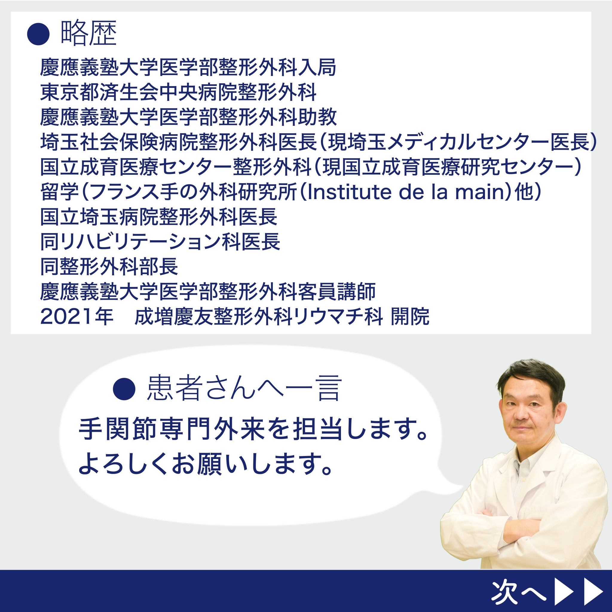 このたび、北城前院長が足立整形外科・リウマチ科クリニックだけでなく、慶友整形外科脊椎関節病院も統括する理事長業務に専念することになったため、私が当クリニックの院長を引き継がせていただくことになりました。これからも前院長の方針を引き継ぎ、城東地区を中心とした地域住民の皆様のお役に立てるよう精一杯努力してまいります。