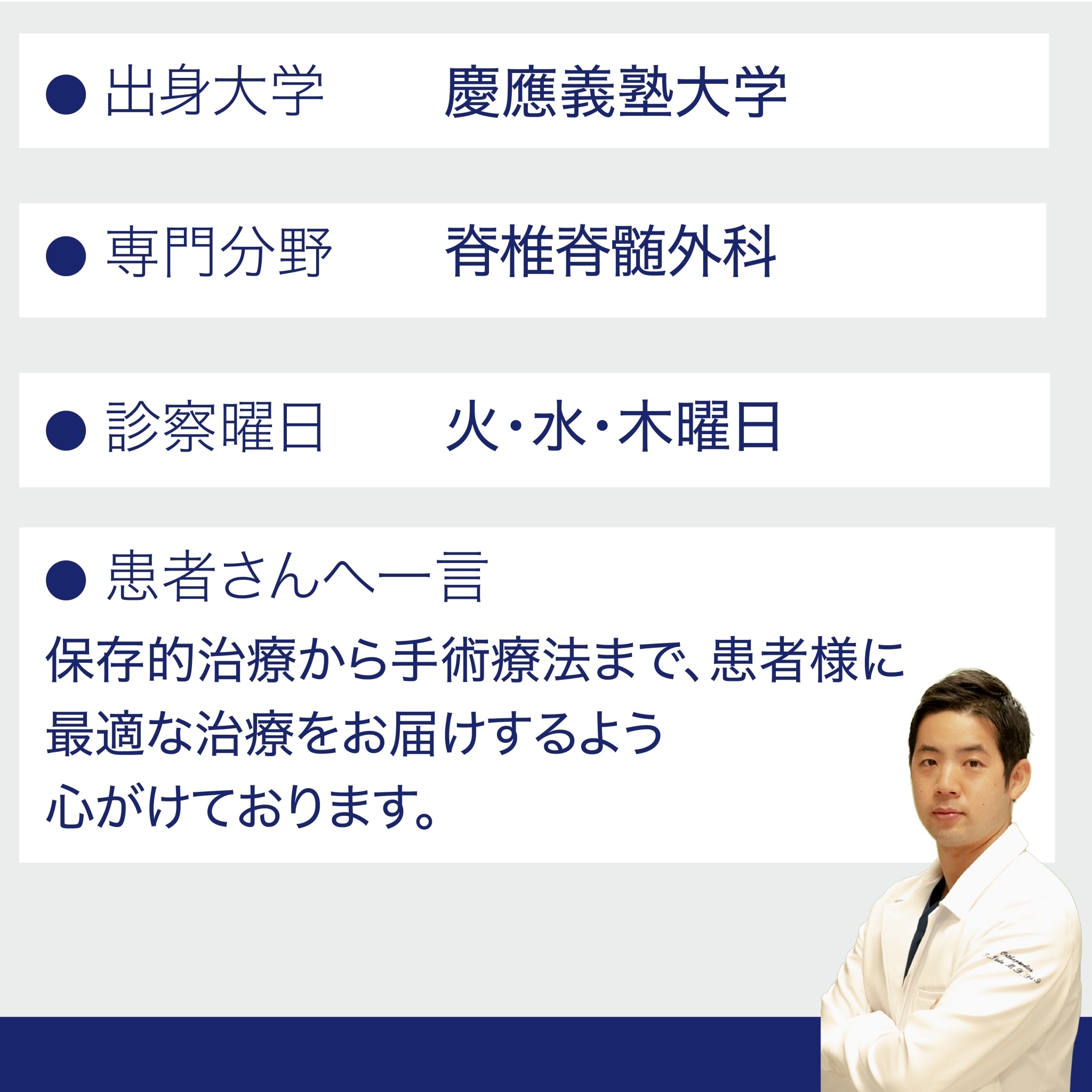 脊椎疾患は病態が複雑であることが多く、慎重な経過観察を要する患者様や早期の手術が必要な方が見過ごされてしまったり、逆に手術が不要な方に手術が行われしまったケースにしばしば遭遇します。脊椎専門医・指導医として、患者様に正しい情報をわかりやすくお伝えし、一人一人のニーズに合った様々な治療法を提供できるように心得させていただきます。