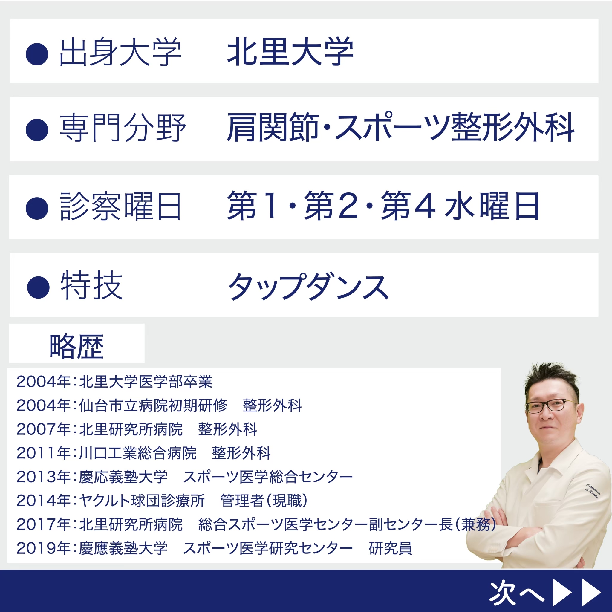 これまで勤務した病院の患者さんはスポーツ選手もいましたが、スポーツをしていない子供からお年寄りまで診察させていただき、関節の痛みがなく元気に生活ができることを目指してきました。それに加えて、現在はプロ野球の東京ヤクルトスワローズのチームドクターとしての経験も皆さんの診療に生かして、サポートしていきます。