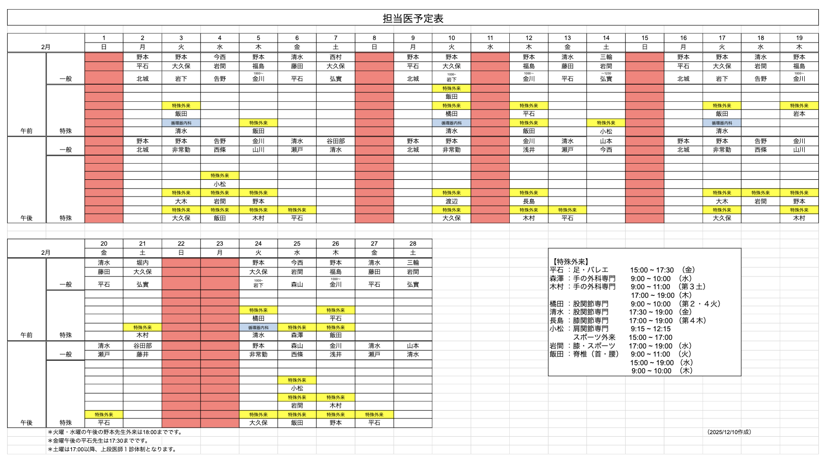 2026年2月の診療日と医師診療予定表について