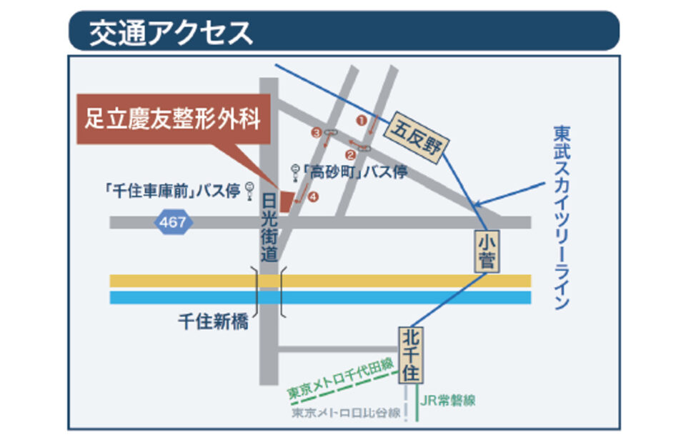 足立慶友整形外科は、東部スカイツリーライン五反野駅から徒歩8分です。