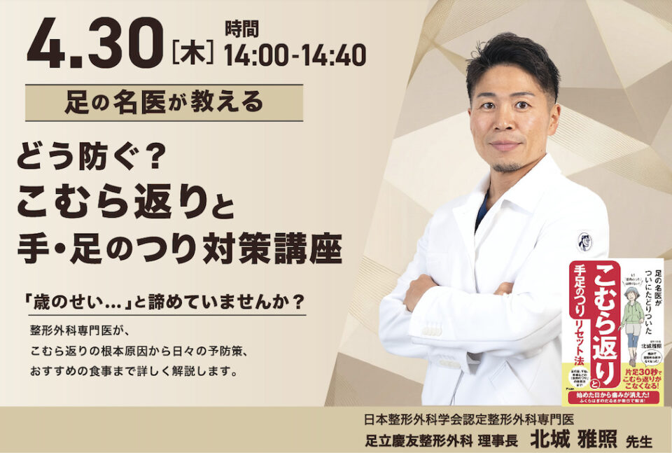 足立慶友整形外科の理事長 北城先生が、皆さんが抱える、手・足のつり対策について、無料でご相談に応じます。
